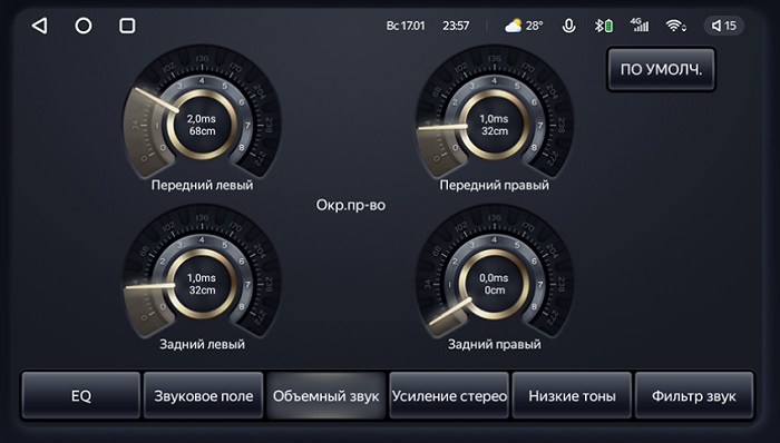 Исключительная обработка звука DSP. 36 - полосная глобальная регулировка эквалайзера в диапазоне от низких частот (20HZ) до высоких частот (20KHZ). Можно выполнить детальную настройку необходимых параметров воспроизведения. Так же можно настроить каждую из 4-х колонок по отдельности и создать такую акустическую среду, какая необходимо именно Вам. Таким образом Вы можете создать эффект присутствия в концертном зале и наслаждаться живым звуком прямо у себя в автомобиле. Усилить басы и отфильтровать высокие частоты тоже не проблема.