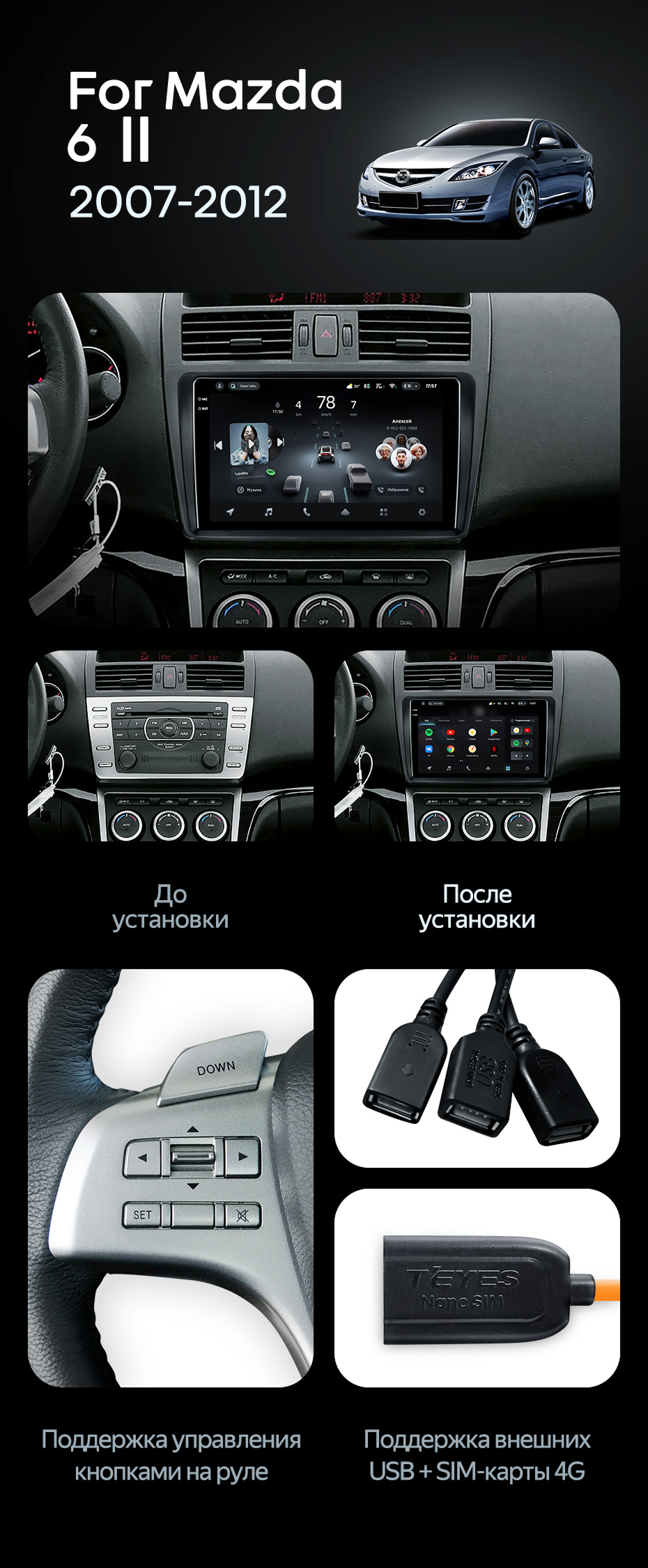 Штатная магнитола Teyes CC4 Pro 8/128 Mazda 6 2 GH (2007-2012) - купить всего за 58 380 руб. в интернет-магазине в Нальчике Teyes.com.ru. ✓ Самый лучший выбор мультимедиа ✓ Лучшая замена штатному ГУ ✓ Тел. +7 (800) 775-31-74